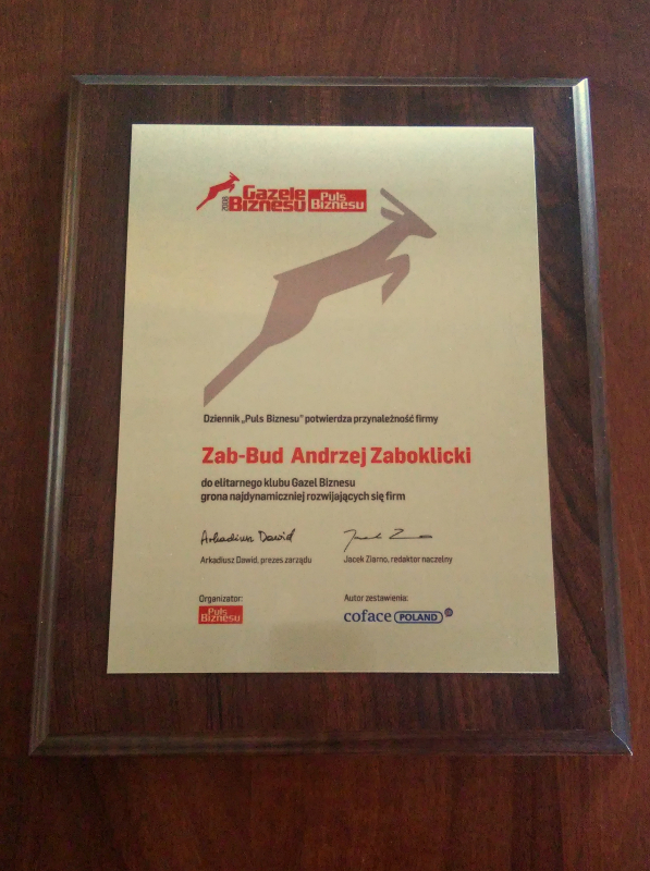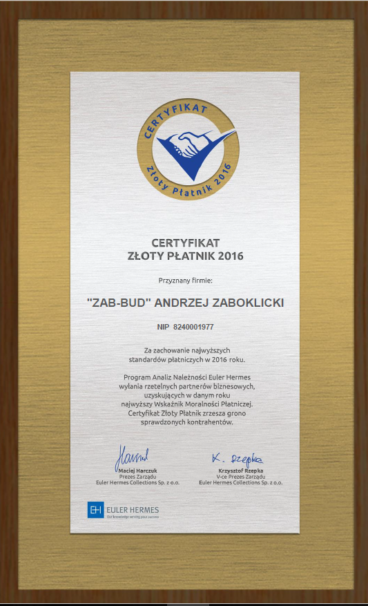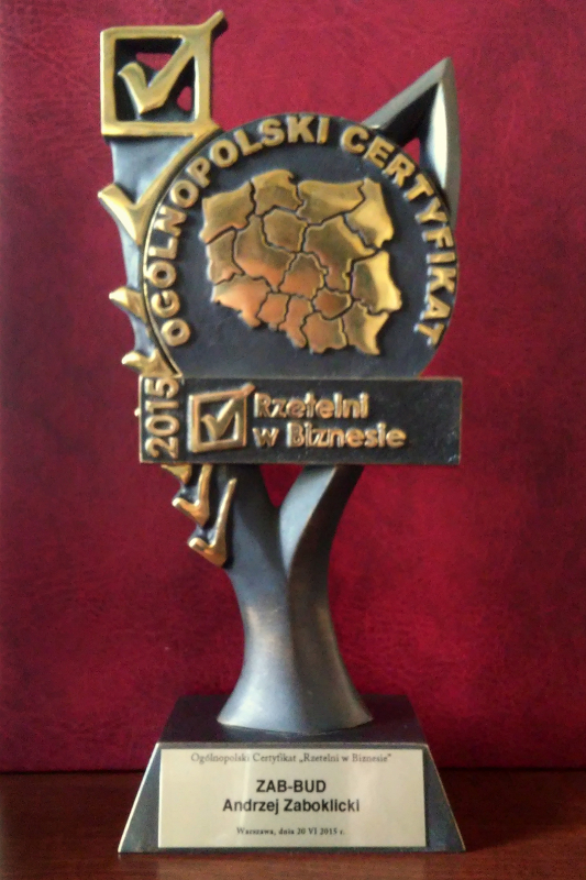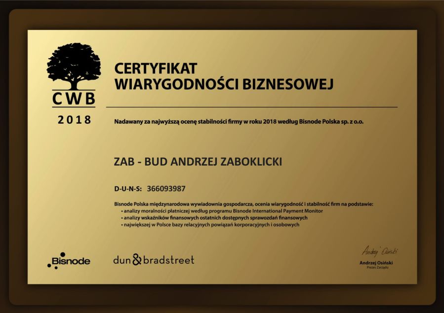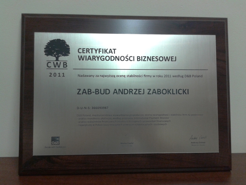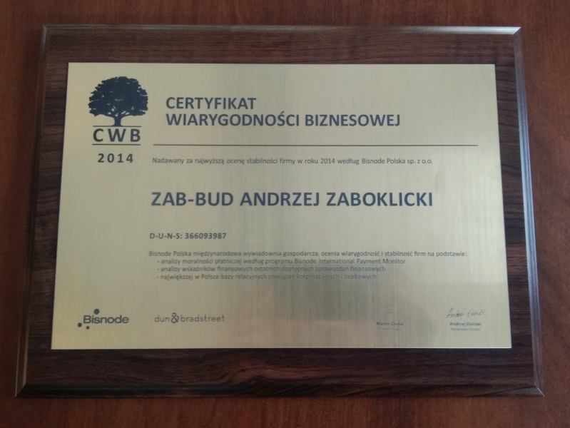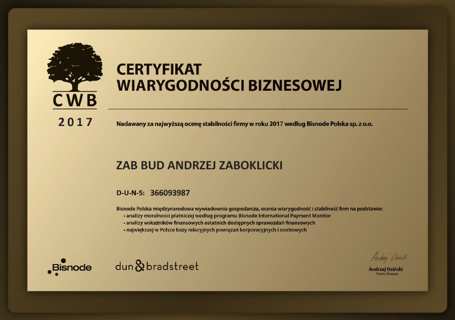 ZAB-BUD cieszy się opinią wiarygodnej i pewnej firmy budowlanej o czym świadczą liczne nagrody i wyróżnienia, w tym Kreator budownictwa roku 2013 czy II nagroda w konkursie Orły budownictwa 2014 w kategorii Generalny Wykonawca. Naszą wiarygodność jako partnera biznesowego potwierdza m.in. Certyfikat Wiarygodności Biznesowej, tytuł Rzetelni w Biznesie czycertyfikat Dynamiczna Firma. Firma ZAB-BUD jest także laureatem Diamentów Forbesa 2015, a ostatnio certyfikatem wiarygodności Creditreform C.