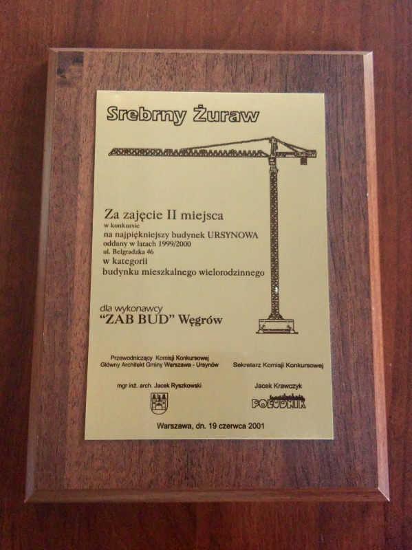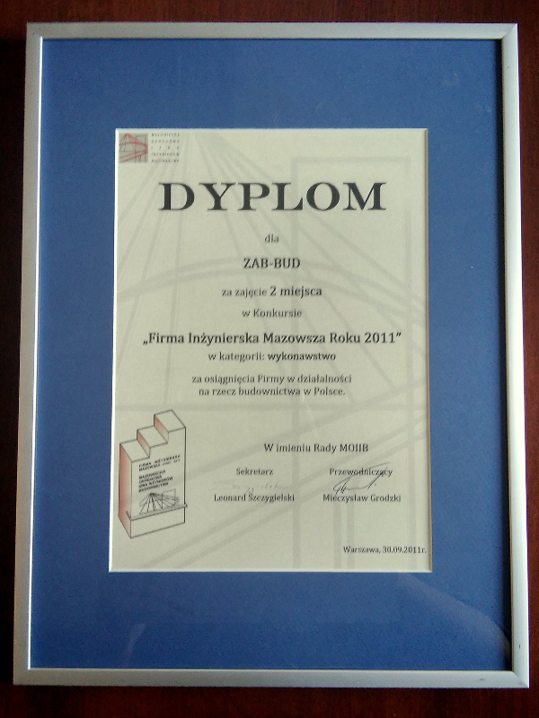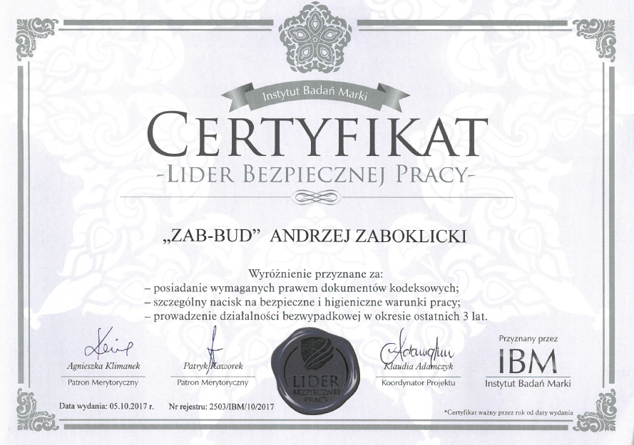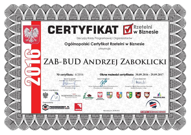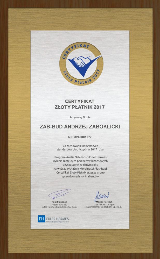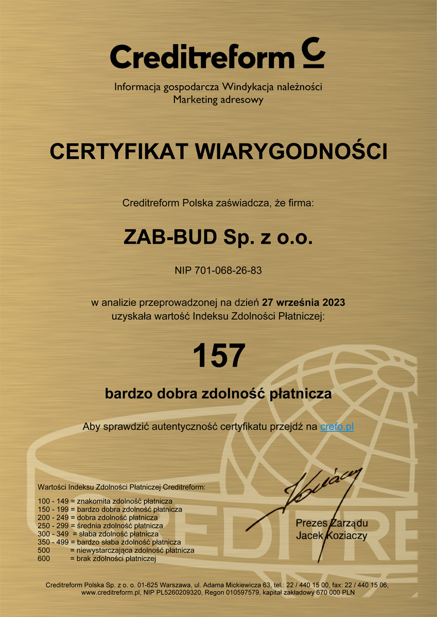 ZAB-BUD cieszy się opinią wiarygodnej i pewnej firmy budowlanej o czym świadczą liczne nagrody i wyróżnienia, w tym Kreator budownictwa roku 2013 czy II nagroda w konkursie Orły budownictwa 2014 w kategorii Generalny Wykonawca. Naszą wiarygodność jako partnera biznesowego potwierdza m.in. Certyfikat Wiarygodności Biznesowej, tytuł Rzetelni w Biznesie czycertyfikat Dynamiczna Firma. Firma ZAB-BUD jest także laureatem Diamentów Forbesa 2015, a ostatnio certyfikatem wiarygodności Creditreform C.