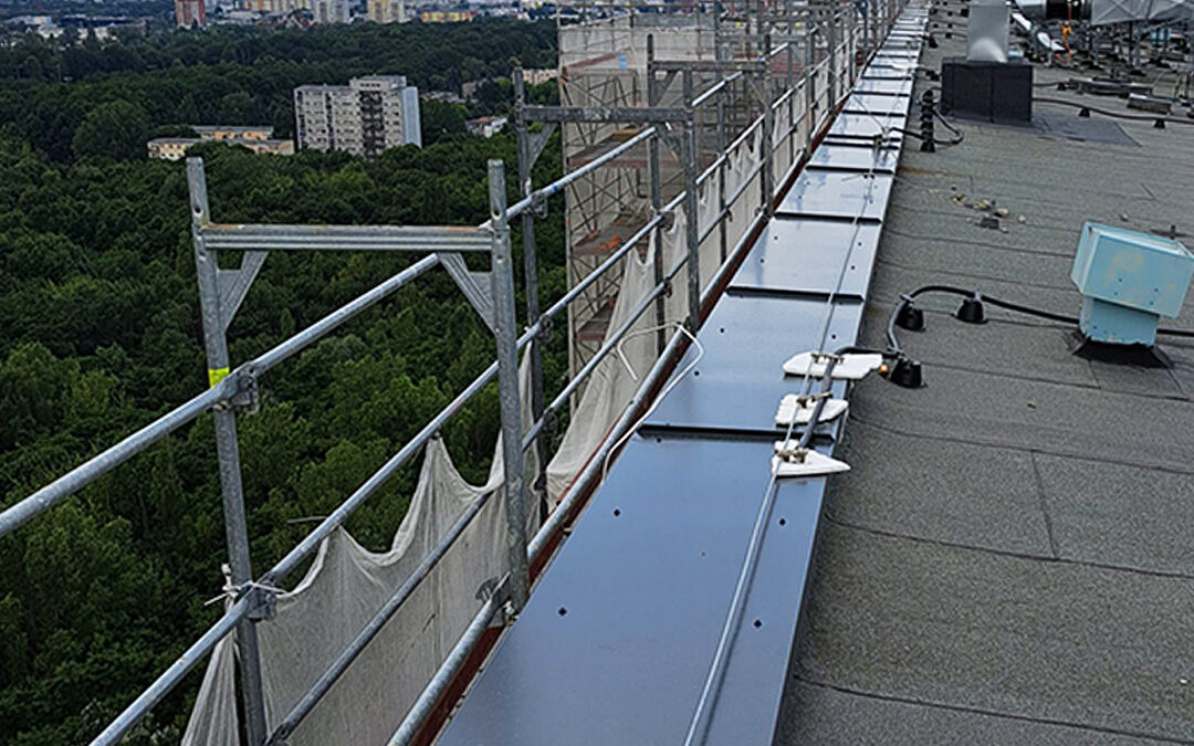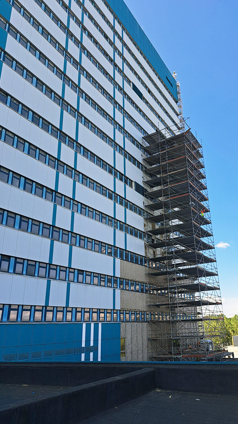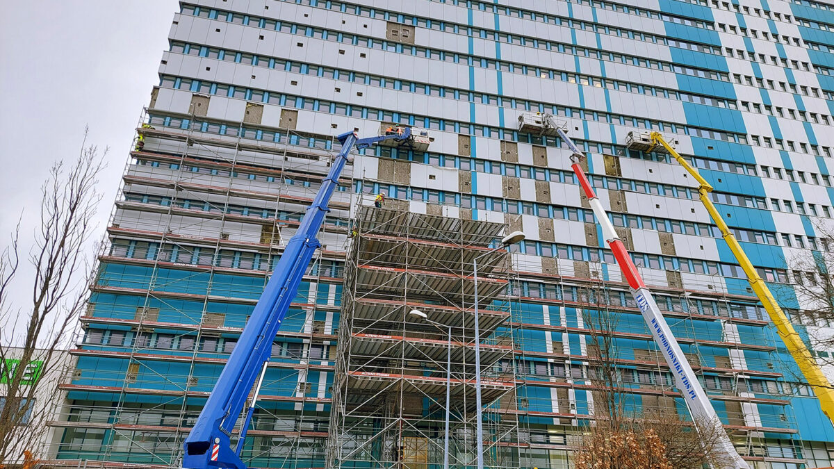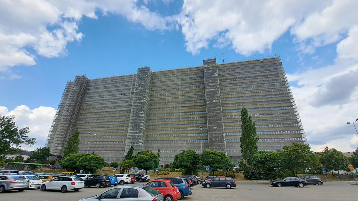 Głęboka termomodernizacja, całość fasady budynku A1 od kondygnacji P02 (wraz z wyburzeniem i montażem nowych schodów i zadaszenia dla wszystkich wejść. Roboty budowlane obejmują swoim zakresem również termomodernizacją ścian fundamentowych do wymaganego poziomu.